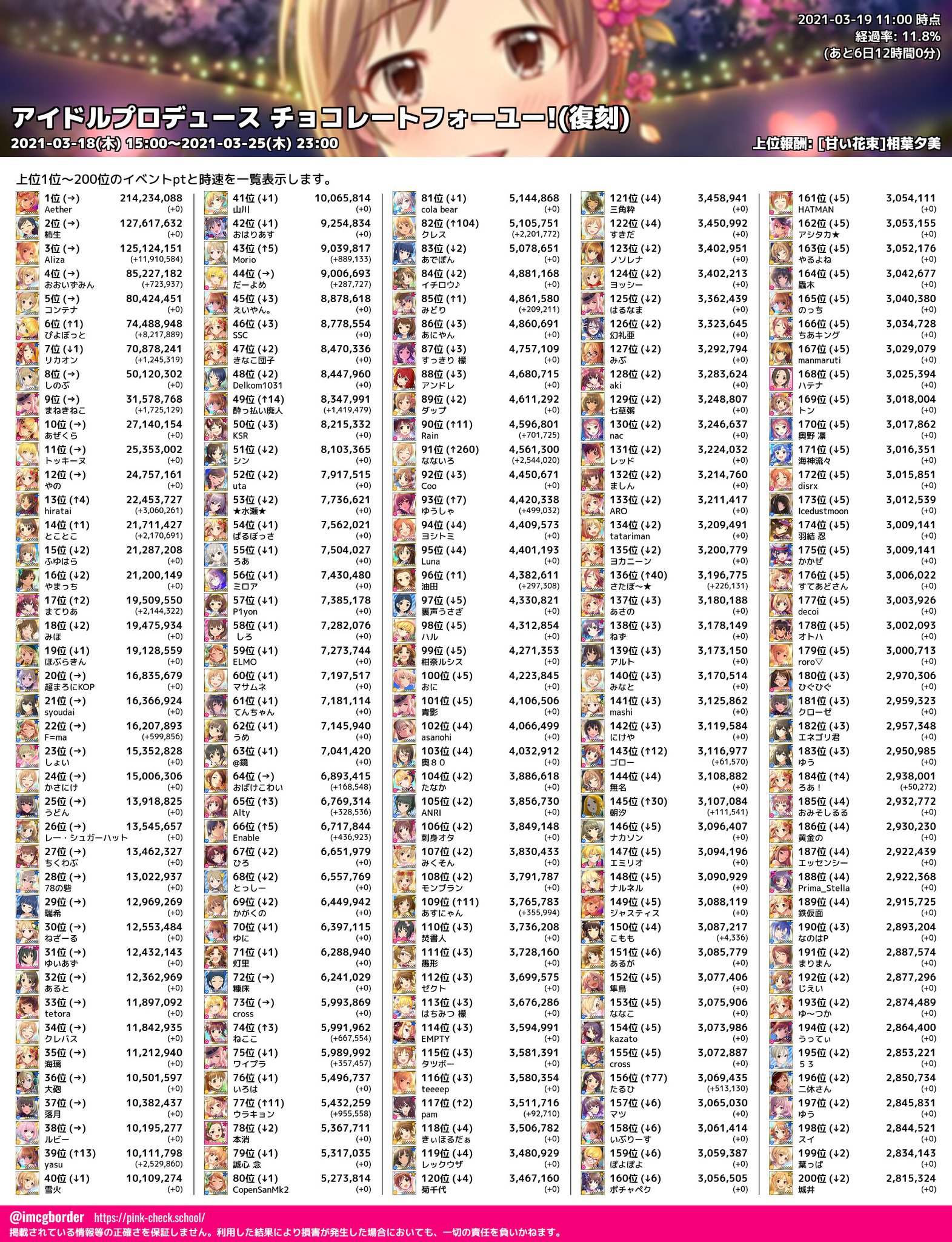 Uzivatel デレマスボーダーbot Na Twitteru チョコレートフォーユー 復刻 上位p Pt一覧 03 19 11 00 11 8 時速 直近1時間上位 最速p Aliza 12 385 103 2位 Aether 10 640 197 3位 ぴよぼっと 9 000 614 4位 Yasu 5 151 435 5位 まねきねこ 3 553 272